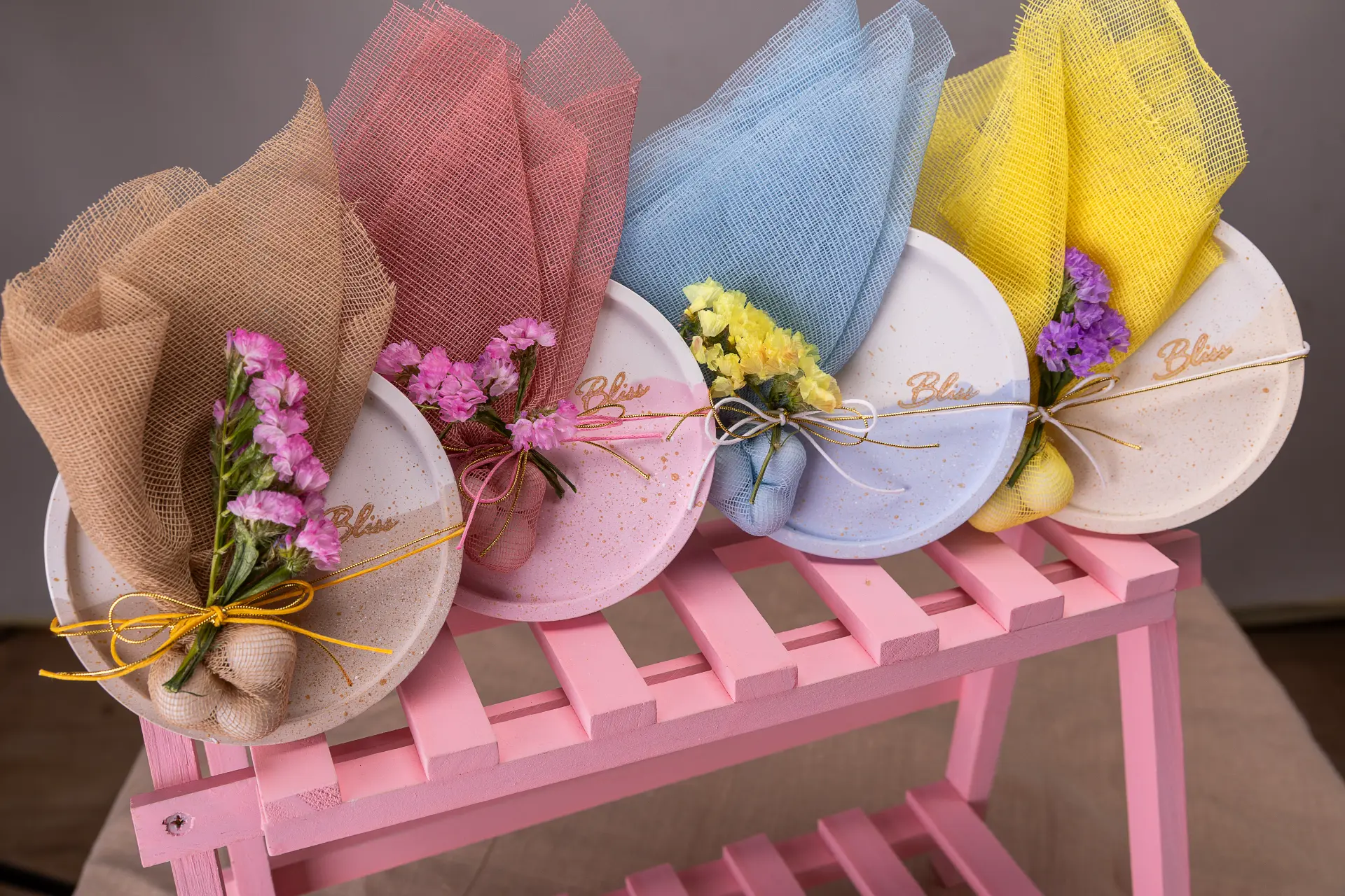 Περιλαμβάνει 3 κουφέτα (crispy ή απλά αμυγδάλου), δεμένα με βαμβακερή γάζα, δίχρωμο σπάγκο και αποξηραμένα άνθη.