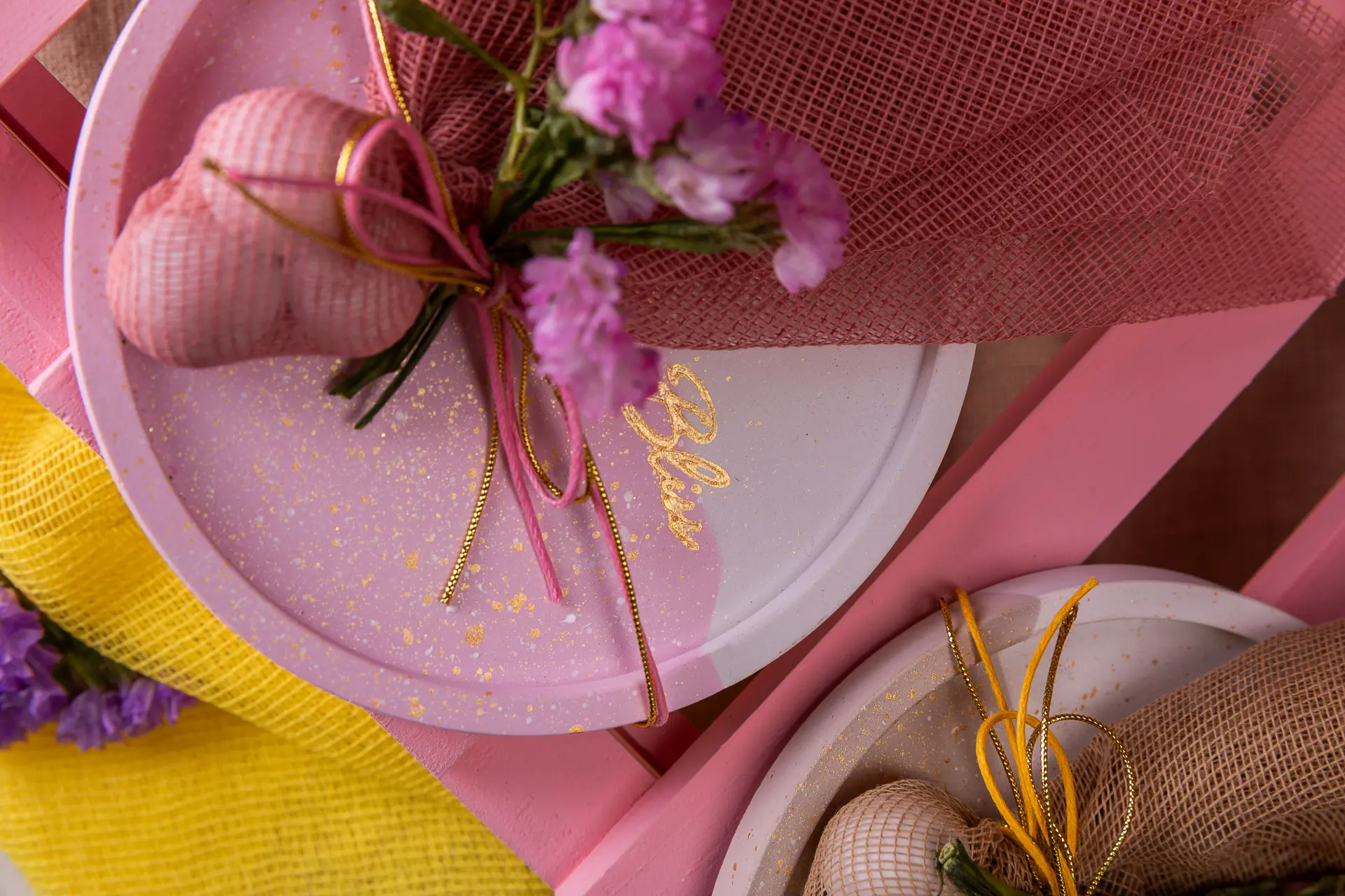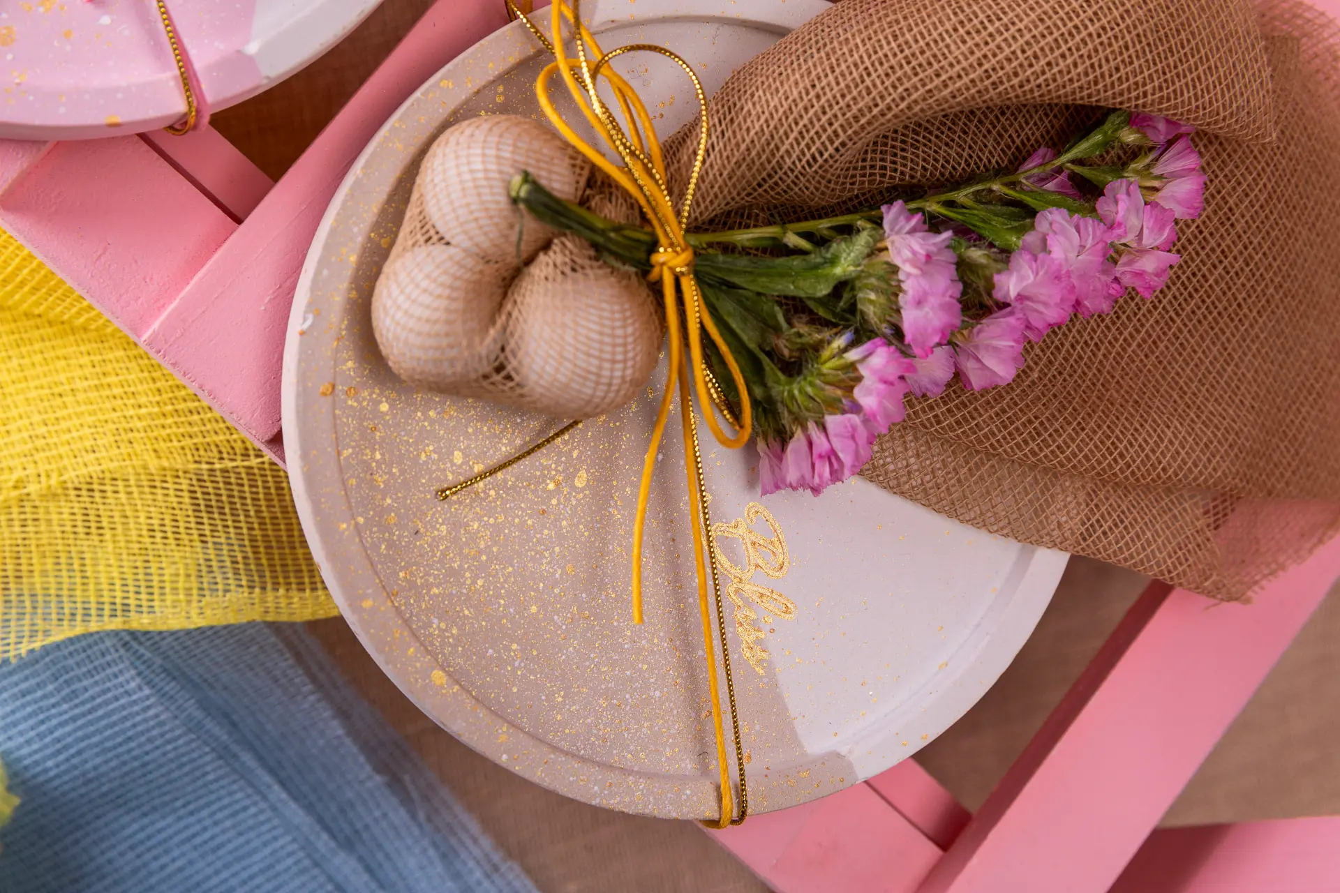 Χειροποίητο δίχρωμο σουβέρ με χρυσές λεπτομέρειες, άνθη αμάραντου και διακριτική boho αισθητική. Η διχρωμία εκφράζει την αρμονία και την ισορροπία μιας νέας, ευλογημένης αρχής. Αρμονία αποχρώσεων σε μια ευλογημένη στιγμή!