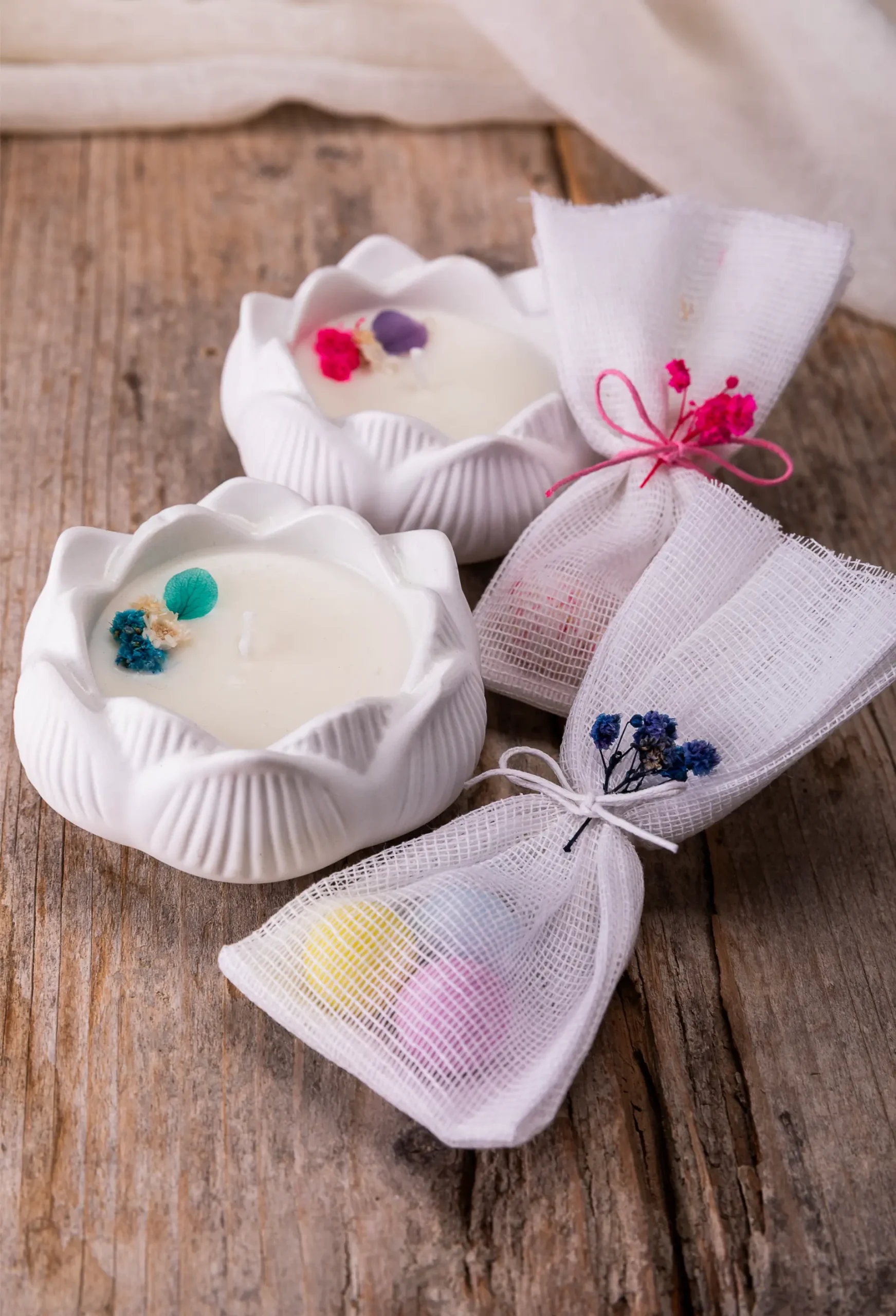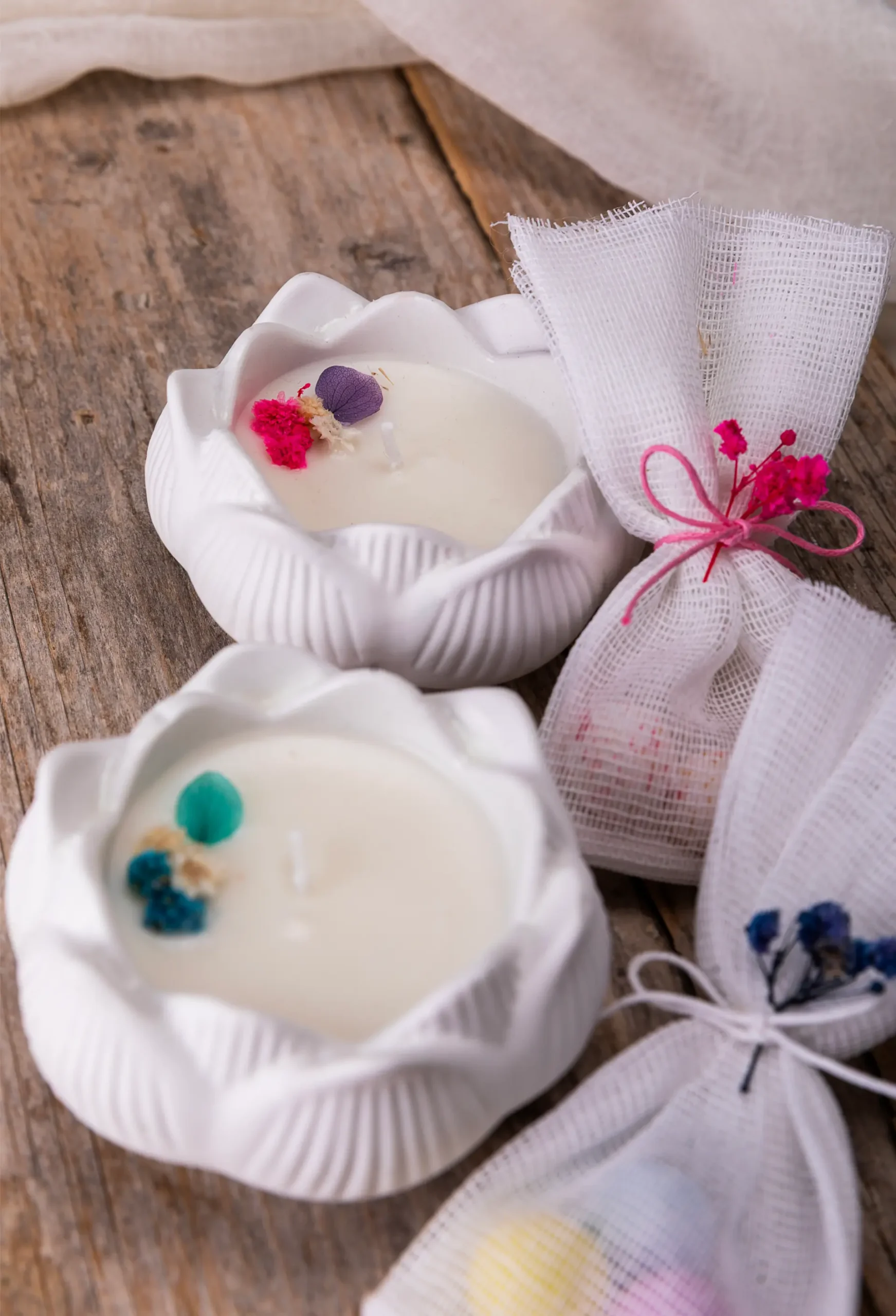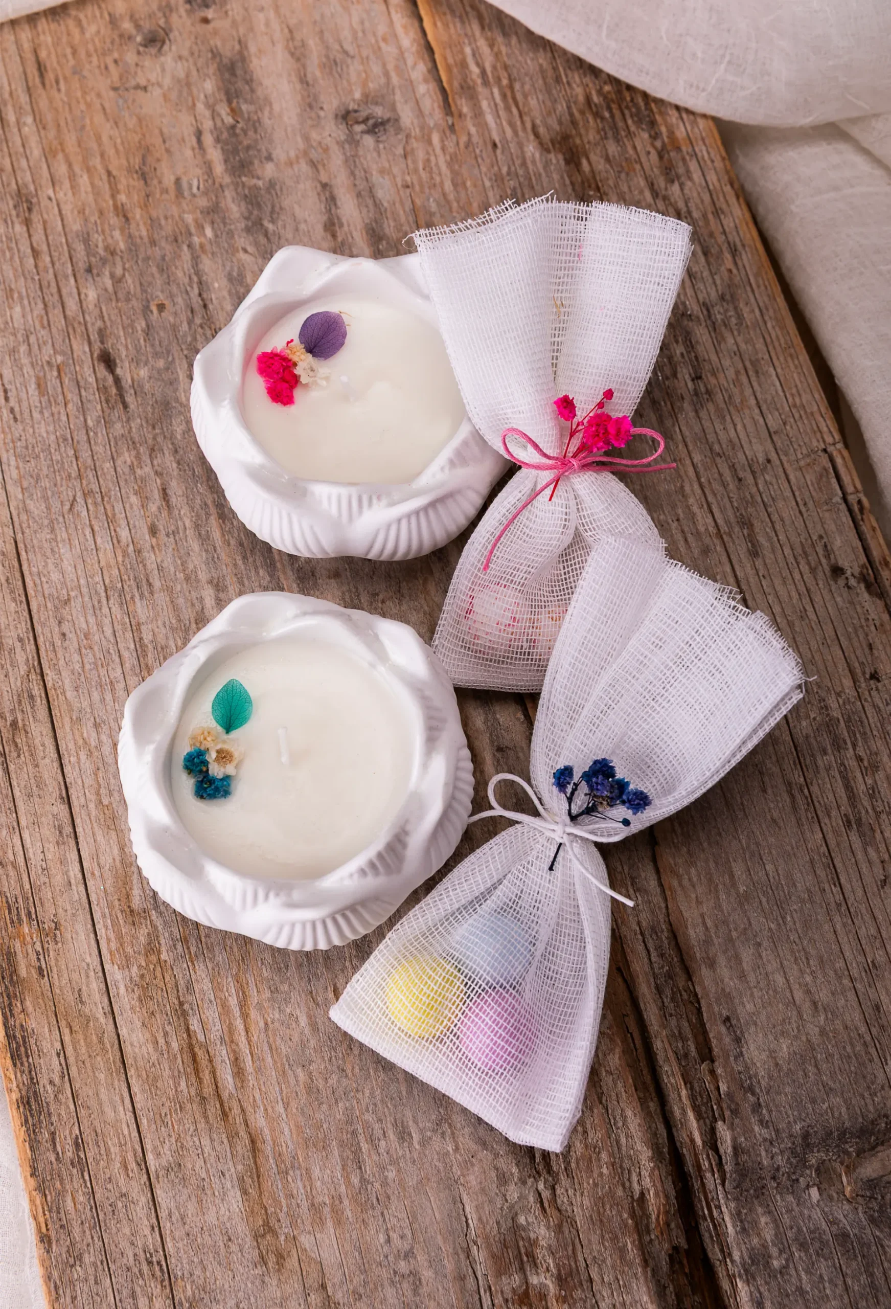 Χειροποίητο κεραμικό δοχείο με απαλές καμπύλες σε σχήμα λουλουδιού, με αρωματικό φυσικό κερί και διακριτικά αποξηραμένα άνθη, συνοδευόμενο από πουγκί γάζας με κουφέτα. Σαν μικρό άνθος φωτός, κρατά την τρυφερότητα και την ευλογία μιας νέας αρχής!
